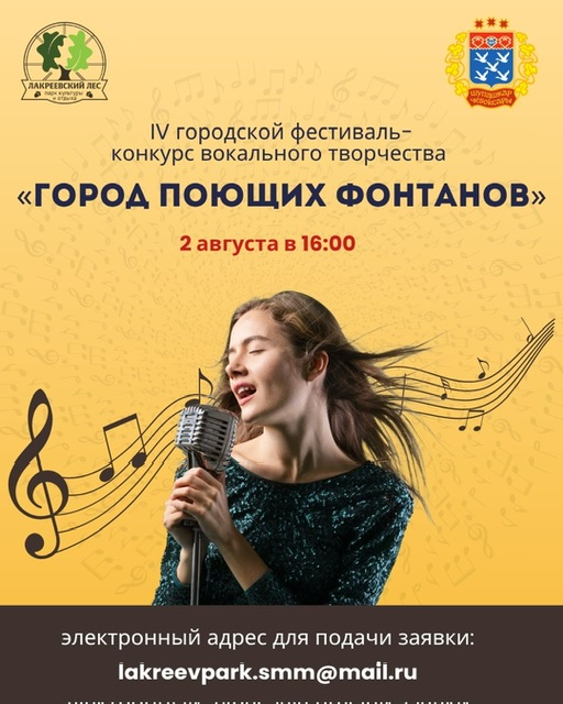 Дорогие друзья! Совсем скоро в нашем прекрасном Лакреевском парке состоится особое событие — IV городской фестиваль-конкурс вокального творчества «Город поющих фонтанов». Это мероприятие приурочено к году защитника Отечества в России и году Победы в Чувашской Республике, а также к празднованию 556-летия нашего любимого города Чебоксары.