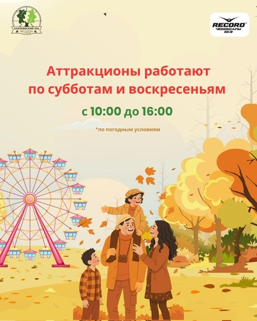Друзья, напоминаем вам, что аттракционы работают по субботам и воскресеньям с 10:00 до 16:00, чтобы подарить вам классное настроение и заряд бодрости.
